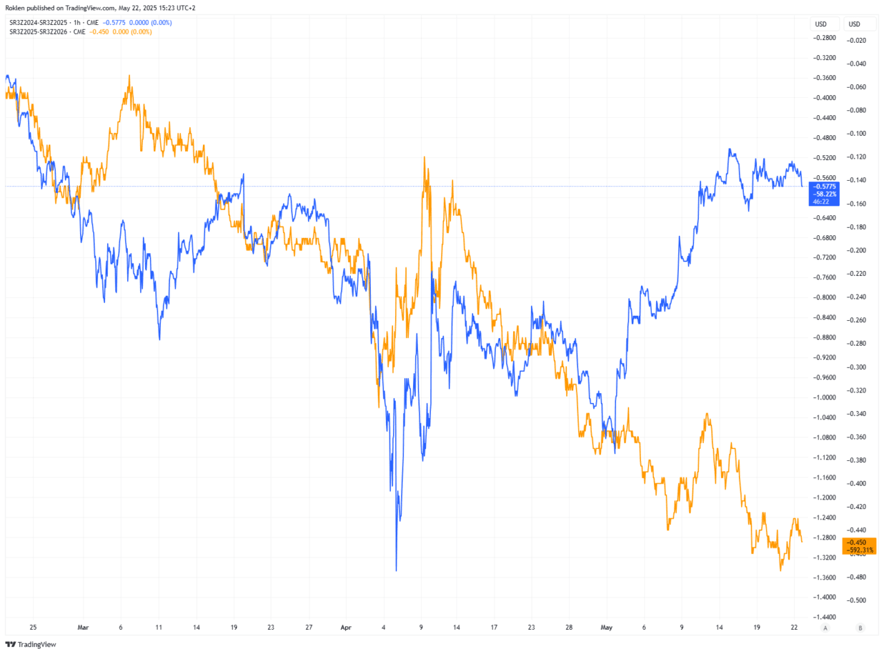 U výhledu výkonu ekonomiky mohou posloužit futures sazebý SOFR, které zůstávají relativně beze změny v letošním roce, tj. snížení sazeb o cca 58 bodů. V tom příštím jsme na 45 bodech.